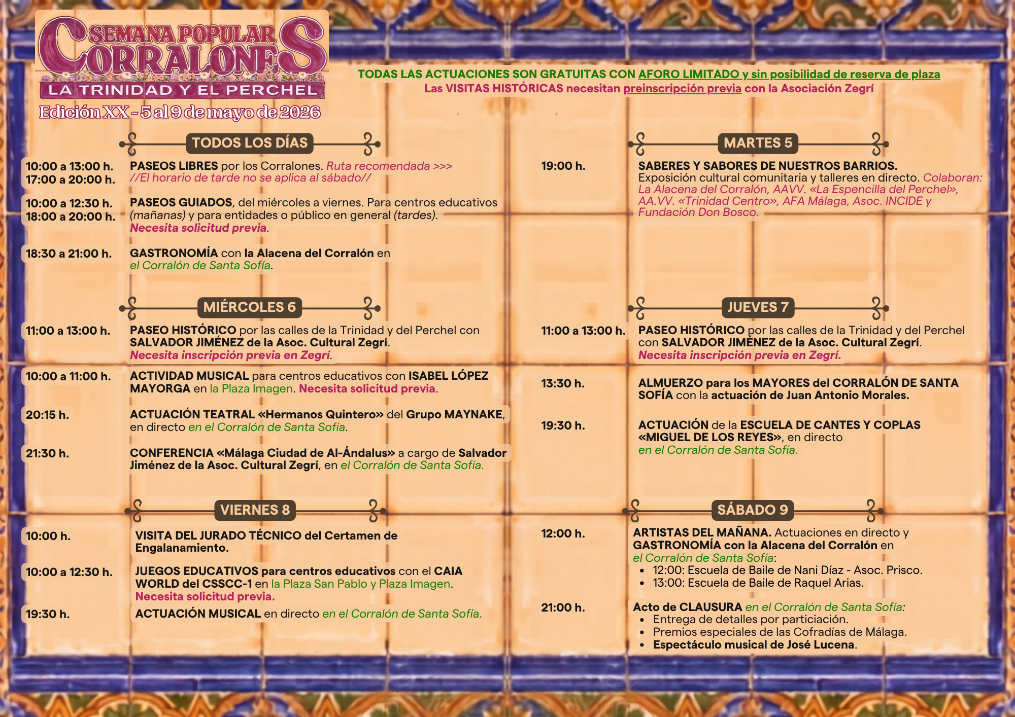 Si por el contrario, lo que deseas es participar en alguna de las actividades de esta semana, debes saber que todas son LIBRES (SIN RESERVA) HASTA COMPLETAR AFORO, exceptuando las VISITAS HISTÓRICAS (en cuyo caso debes ponerte en contacto con la Asociación Zegrí en el teléfono 952 29 15 70, de lunes a viernes entre las 9:00 h. y las 13:00 h.).